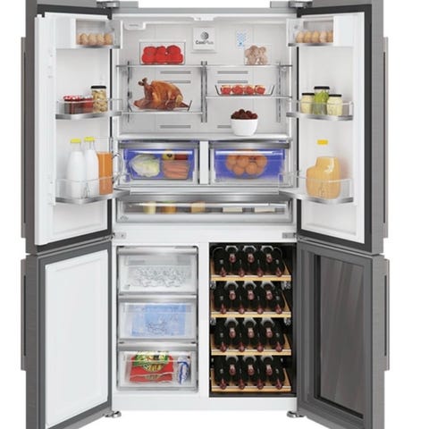 Til venstre er frysesektionen, hvor der er integreret is- og vanddispenser i døren. Til højte er kølesektionen, hvor øverste yderlåge har en særlig opbevaring til drikkevarer.