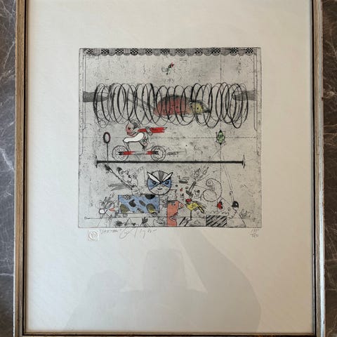 Indrammet kunstplakat med surrealistisk motiv. Billedet viser en trappe, en dør og to figurer i et stiliseret, tegneserieagtigt udtryk. Farverne er primært dæmpede nuancer af rosa, beige og blå. Plakaten er monteret i passepartout og ramme med glas, velegnet til ophængning i stue, kontor eller gang. Egnet som vægdekoration for dem, der foretrækker grafiske og fantasifulde motiver.