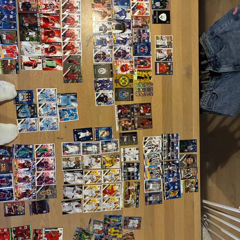 Topps Match Attax fodbold samlekort blandet lot. Samlingen omfatter et større antal forskellige fodbold samlekort fra Topps Match Attax-serier, herunder almindelige kort og specialkort i forskellige farver og designs. Der ses kort fra flere sæsoner og turneringer samt mapper og hæfter til opbevaring. Egnet til samlere, der ønsker ekstra kort til at udvide eller supplere eksisterende samlinger af Match Attax fodboldkort.