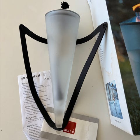Menu Torche Cone fakler til udendørs brug. Sættet indeholder to kegleformede fakler, designet af Pernille Vea. Faklerne er udført i mat glas og blank stålfinish i toppen. De er beregnet til at blive stukket i jorden, eller hængt op på væggen i de medfølgende gummiophæng. f.eks. i have, sand eller krukker, og anvendes med lampeolie. Velegnet til at skabe belysning og stemning udendørs på terrasse, altan eller i haven.