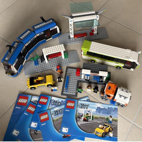 Sættet er ikke komplet, men har et par mindre mangler. Mangler den røde container med indhold på den ene vogn, 3 lige skinner, en enkelt klods på loko, et hegn på kran, en holder til træ på vogn, 2 små hjul på gaffeltruck er hvide i stedet for grå, samt 4 figurer, alt burde kunne ses på foto.