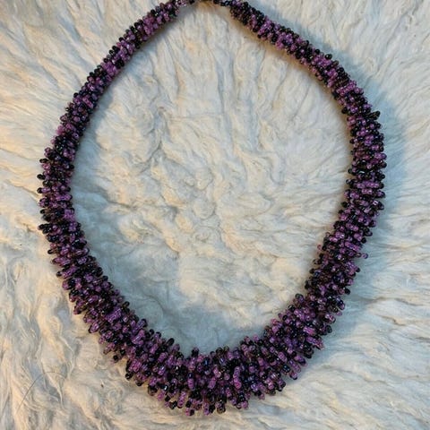 Halskæde med lilla perler i forskellige nuancer. Brugt 2 gange, i pæn stand. L: 56 cm.