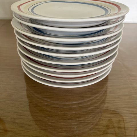 Der er to af hver. 2 middagstallerkner, to dybe tællerkner, to kagetallerkner, to skåle.