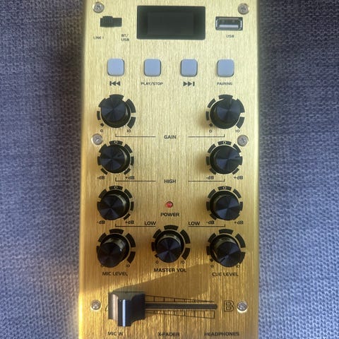 Omnitronic Gnome 202P mini mixer, en kompakt 2-kanals DJ mixer med Bluetooth og indbygget MP3/USB-afspiller, crossfader, EQ og mikrofonindgang. Medfølger jack/RCA-kabler klar til tilslutning. Perfekt til små setups og nem transport.