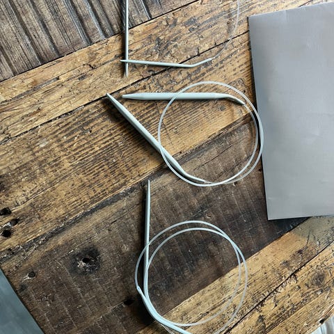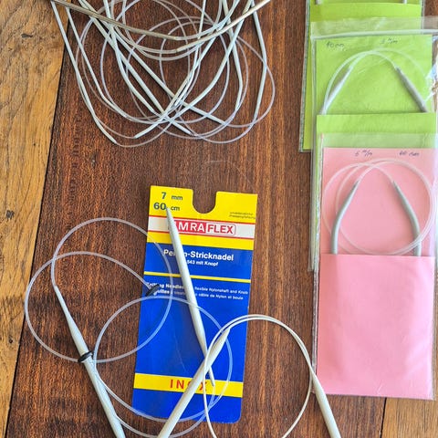 Håndlavet etui til rundpinde i stof. Ydersiden er i ensfarvet stof med lukning i læderrem og metaltrykknap. Indersiden har blomstret foer og flere adskilte rum til organisering af rundpinde i forskellige størrelser og længder. Egnet til opbevaring og transport af strikkepinde og lignende tilbehør.