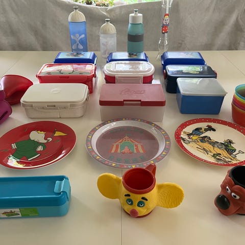 Stand: Delene fra Mepal-Rosti står som nye eller meget pæne. Tallerkenerne og smiley-skålen er brugte og har almindelige brugsspor/patina, men alt er fuldt funktionsdygtigt, intakt og klar til brug.