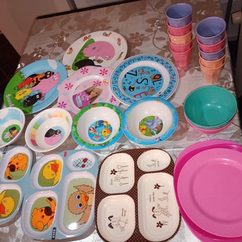 Stort sæt børneservice i melamin - 12 dele inkl. kurv