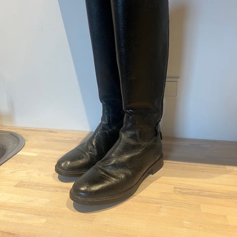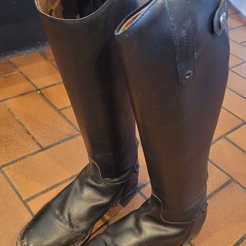 Ridestøvler i sort læder. Høje skaftestøvler med lynlås bagpå og justerbar lukning øverst på skaftet. Flad sål og rund snude. Egnede til ridning eller anden brug, hvor der ønskes en høj, tæt siddende læderstøvle. Målskema på billedet angiver skaftets højde og lægvidde i cm.