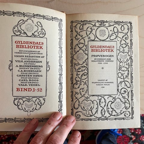 Indbindingen har et gentaget rødt og sort mønster på lys bund. Velegnet til samlere af klassisk dansk litteratur og boghåndværk.