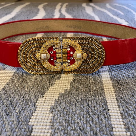 Chicco Wasp Belt damebælte i elastisk materiale i lilla farve. Bæltet har guldfarvet kædespænde foran og er mærket med størrelse 80. Designet er velegnet til kvinder og kan bruges i taljen over kjoler, bluser eller tunikaer for at give form og markering af taljen. Materialet er elastisk tekstil med metalspænde i guldfarve.
