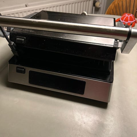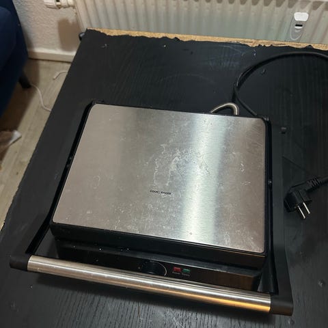 Cook & Baker kontaktgrill med riflet grillplade både i låg og bund. Grillen har elektrisk tilslutning med ledning og er egnet til tilberedning af fx sandwich, kød og grøntsager. Kompakt design, der kan stå på køkkenbordet eller opbevares i skab, når den ikke er i brug. Yder- og inderflader er i metal med non-stick belægning på grillpladerne for nem rengøring.