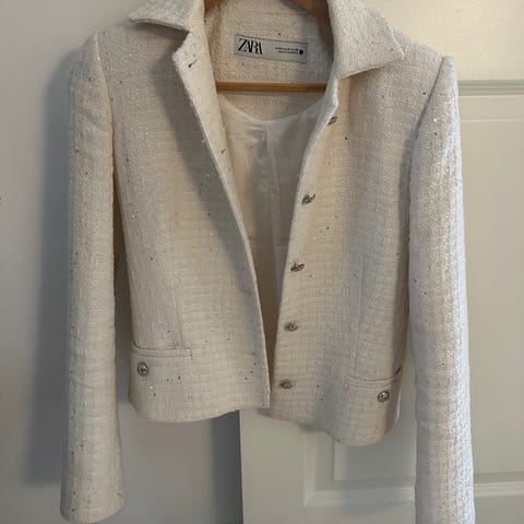 Zara jakke til damer i størrelse XS. Jakken er fremstillet i polyester og har et multifarvet vævet mønster i lyse og mørke nuancer. Den lukkes med knapper foran og har lommer i siderne samt brystlommer med klap. Nederst har jakken en let frynset kant. Velegnet som let yderjakke eller overgangsjakke.