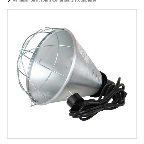 varmelampe med infrarød pære. Lampen har metalreflektor og beskyttelsesgitter foran pæren. Udstyret med ledning, stikprop og kæde til ophæng. Velegnet til punktvarme, f.eks. i mindre rum eller over dyr, hvor der er behov for lokal opvarmning med infrarødt lys.