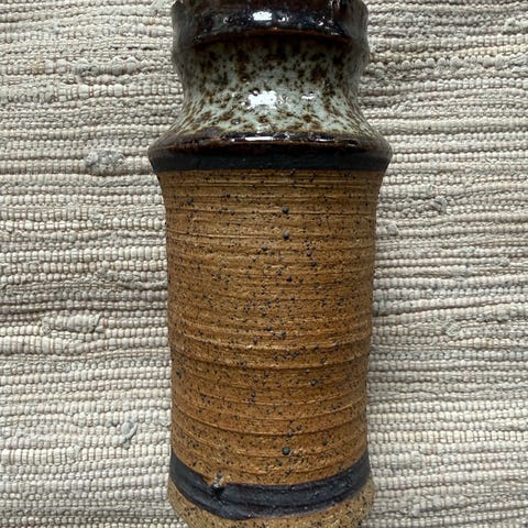 Usædvanlig, lille vase fra det tidlige østtyske Strehla. Udvendig spiral på midten og i blanke glasurer af mørkebrun og en hvidlig-grøn fat lava. Mærket under bund med logo og nummer, samt mulig signatur.