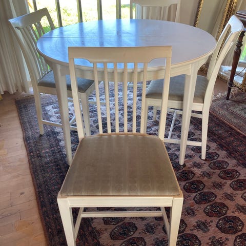 Velholdte Spisebord stole med pænt betræk. Alle 4 Stole 200kr. 70 kr stk. Gammelt rundt Spisebord i Gustavjansk still med 2 indskudsplader. Mål: 110 + 40 x 2 indskudsplader 73 h 1700kr. Benen sidder fast og kan ikke skrues af. Samlet pris 1800kr.