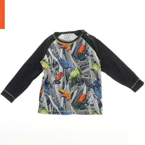 En langærmet bluse med vandrette blå og grå striber. Den har et silhuetmotiv af en tudse på forsiden lavet af prikker. Bagsiden er ensfarvet med striberne.