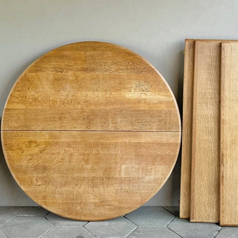 Rundt spisebord i massiv egetræ med to tillægsplader sælges.