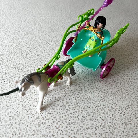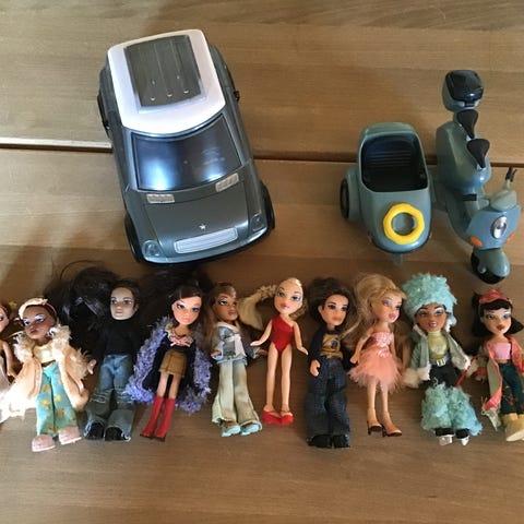 3Stk Playmobil figurer en stor Playmobil bil og to figurer pige med lyserødt hår og en pige med blåt hår.