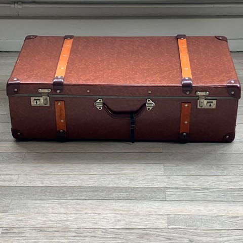 Magnifik original rejsekiste, dateret omtrent mellem slutningen af det 19. århundrede og begyndelsen af det 20. århundrede, med en ægte charme og stor dekorativ tilstedeværelse.
