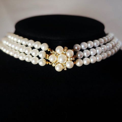 Denne perlehalskæde er lavet af sølvbelagt metal og har en enkelt række håndknudede perler, der mødes ved en mærket lukning bagpå. Vedhænget er prydet med flerfarvede krystaller.
