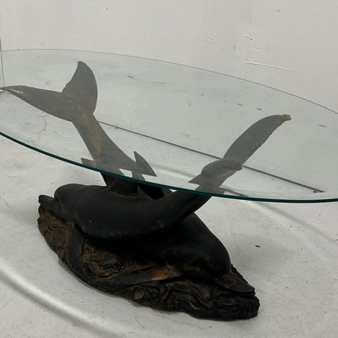 Moderne sofabord fra Frankrig fra 1970–1980 med glasplade med trykt dobbelt hemisfærisk verdenskart, mahogni stel, firkantede ben med messingbeslag, forbundet af en H-formet tværstang; mål 102 cm bred, 39 cm høj, 61 cm dyb; i god stand med små aldersmærker og pletter. Klik på den blå "gå til varen" knap, for at købe eller byde på denne vare. Den samlede pris vil blive vist inden du afgiver dit bud.