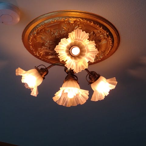 Venezia Murano glasblomsterrantelampe fra 1970'erne/1980'erne, metalramme med guldfinish, margheriter i Murano glas, 5 lys, diameter 60 cm, højde 115 cm, vægt ca. 10 kg, fremstillet i Italien, i god brugt stand med mindre aldersmærker og fuldt funktionsdygtig; pærer inkluderet ikke; komplet med alle komponenter og delvist afmonteret af sikkerhedshensyn. Klik på den blå "gå til varen" knap, for at købe eller byde på denne vare. Den samlede pris vil blive vist inden du afgiver dit bud.