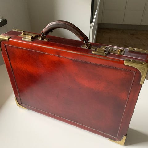 Brun læder arbejdstaske, 40 cm bred og 29 cm høj, med indvendige rum til pc og dokumenter, bagpå lynlåslomme, udvendigt rum til paraply eller avis og to forsider med autolukket klips; medfølger skulderrem; i god brugt stand med synlige slidmærker. Klik på den blå "gå til varen" knap, for at købe eller byde på denne vare. Den samlede pris vil blive vist inden du afgiver dit bud.