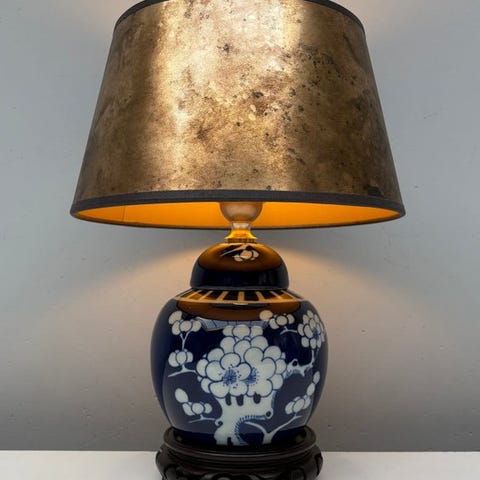 Vintage bordlampe fra Le Dauphin, Frankrig, 62 cm høj, 34 cm bred, 25 cm dyb, materiale keramik, messing og stof, én fatning, ca. 4 kg, dateret 1970–1980, i fremragende stand og i funktion. Klik på den blå "gå til varen" knap, for at købe eller byde på denne vare. Den samlede pris vil blive vist inden du afgiver dit bud.