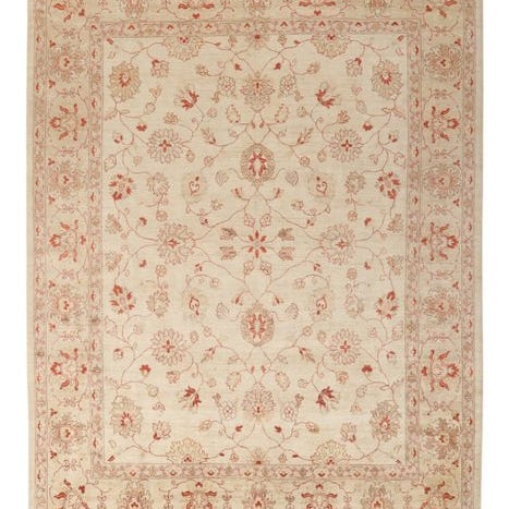 Ekstraordinært, storformatet designer-tæppe med elegant Ziegler Farahan-mønster i en moderne fortolkning. Den lyse, naturfarve bundtone harmonerer perfekt med det varme terracotta-rose i det centrale ornamentfelt og giver tæppet en stilfuld, rolig udstråling.