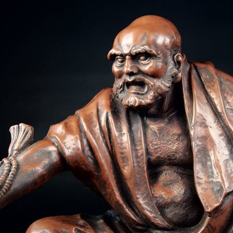 En stor træfigur af den ædle buddhistiske munk Bodhidharma 菩提達磨, almindeligvis kendt som Daruma 達磨 (482–539), den legendariske grundlægger af Zen-buddhismen.