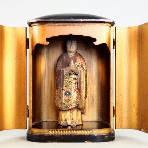 Original japansk træskulptur fra Taishō-perioden af Bodhidharma, siddende på en sort lakkeret stol med glasinlagt øjne; samlede mål 57 × 46 × 24 cm (figur 44 × 30 × 20,5 cm), to-objekt-sæt, i god stand med sædvanligt misfarvning og lakslid, restaureringer; certifikat for ægthed inkluderet. Klik på den blå "gå til varen" knap, for at købe eller byde på denne vare. Den samlede pris vil blive vist inden du afgiver dit bud.