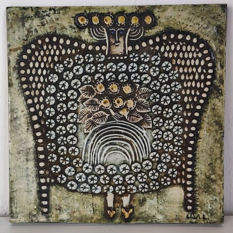 En god størrelse 1960'er modernistisk stenware plaque, måler ca. 35 x 35,5 cm og vejer 3668 g, dekoreret med polykrome emaljer i relief for at skildre to heste. Mærket på bagsiden med producentmærket Schäffenecker, Ulm.
