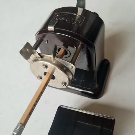 Dette apparat er et sjældent og ikonisk eksempel på en tidlig mekanisk blyantspidser, Jupiter 1. Produceret af den velrenommerede tyske virksomhed Guhl & Harbeck i Hamburg i begyndelsen af det 20. århundrede (ca. 1905/1915). Enheden er kendt for sin uovertrufne og avancerede slibeteknik.