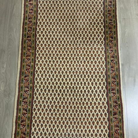 Tæppet er håndknyttet af uld på en bomuldsbas, hvilket giver holdbarhed og en behagelig struktur.