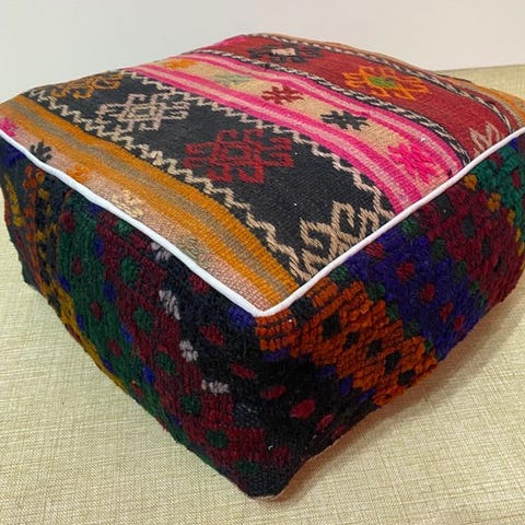 Vores puffer er et vidunderligt dekorativt produkt, som du nemt kan bruge i alle hjørner af dit hjem og din have. Størrelsen på puden er ca. 48 (bredde) x 48 (længde) x 25 (højde). Vores puffer er lavet af 100% ren uld fra gamle tæpper. Da de originale anatolske tæpper bruger naturlige farvestoffer og materialer, er hvert stykke unikt. Der kan ses forskelle i farver, naturlig slitage, asymmetriske mønstre og linjer – dette er naturen af gamle tæpper, hvilket gør dem unikke kun for dig. Vores puffer er håndlavede med den højeste kvalitet af syning, så du kan nyde dem i mange år. Det er op til dig at fylde den, du kan fylde den med skumstykke, formet skum, uld eller bomuld. Den sendes tom. Den vil blive afsendt inden for 3 dage. Told,