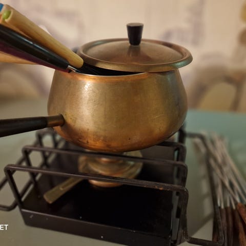 Pragtfuldt fondue-bourguignonne-sæt i emaljeret støbejern fra det berømte franske mærke Cousances af Le Creuset.