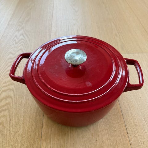 Superb oval emaljeret støbejerngryde fra den prestigefyldte franske fabrik Cousances, anerkendt for kvalitet og holdbarhed i deres kogegrej, og i dag en del af Le Creuset-huset.