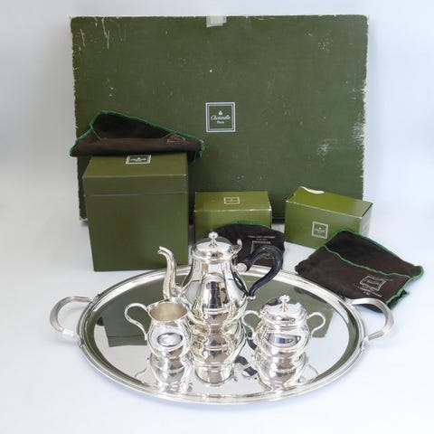 Elegantete service til te og kaffe komplet i argentémetal fra det berømte franske sølvvarefirma Christofle, ikoniske Malmaison-model, inspireret af Empire-stilen og genkendelig på sin dekorative frise af palmetblade.