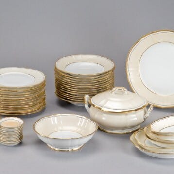 Pragtfuldt service af antikke tallerkener med 39 dele fremstillet af den prestigefyldte fabrik Johann Seltmann Vohenstrauss i Bayern (Tyskland). Sættet udmærker sig ved kvaliteten af den helt hvide porcelæn, dekoreret med en raffineret blå kobolt kant og en geometrisk græk i ægte guld.