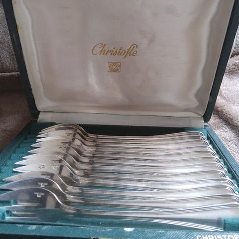 En fin sæt på tolv Christofle sølvbelagte østersgafler, model Malmaison, i deres originale præsentationsæske, hver cirka 14,8 cm lang og samlet vejer de 428 g, stemplet med Christofle fabrikantmærker.