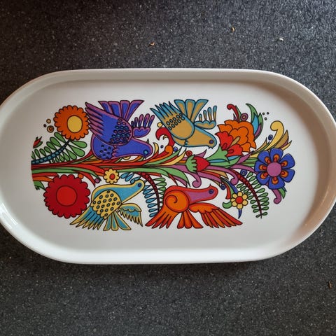 Smuk og farverig Villeroy & Boch-tilsætning fra den ikoniske serie “Acapulco”, inspireret af et mexicansk design. Serien er kendt for sine livlige blomster- og fuglemotiver og er i dag meget eftertragtet hos samlere og entusiaster af vintage design.