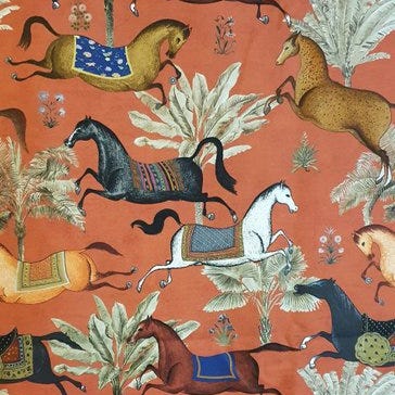Farverne ligger i nuancer af grøn, azur, gul og elfenben.