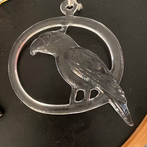 Blå glasophæng med præget motiv. Sættet består af to runde ophæng i gennemsigtigt blåt glas, hver med en diameter på omkring 10 cm.
