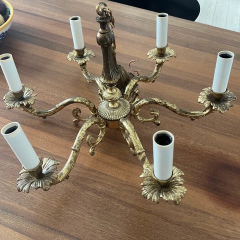 Charmerende vintage lysekrone med 6 arme og fine små forskellige stofskærme. Giver et varmt og hyggeligt lys.
