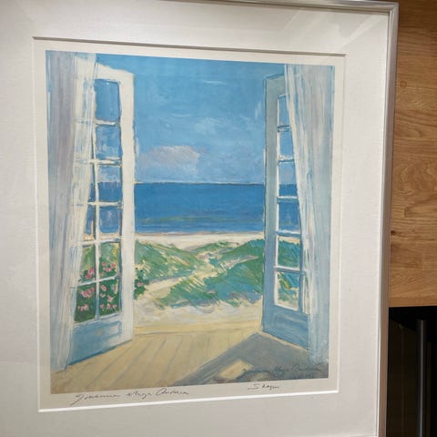 Plakat af åben terrassedør i Skagen med signatur fra Johannes Meyer Andersen "Skagen 1989" som er i trykket og skrevet med blyant under billedet Skagen 1992. Plakaten er stadig klar i farverne. H 62 cm B 45,5 cm i blank aluminiums ramme med glas.