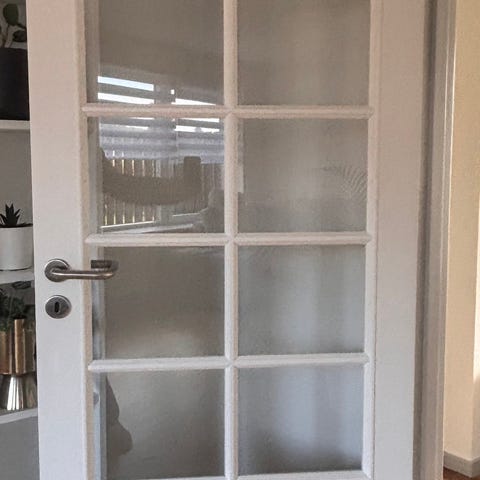 Indvendig glasdør med hvidmalet ramme og sprosser. Døren står som ny. Måler 82 x 203. Karm medfølger.
