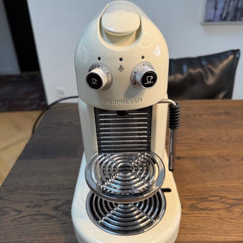 Nespresso kapsel kaffemaskine med integreret mælkeskummer i sort. Maskinen anvender Nespresso-kapsler og har aftagelig vandtank bagtil. Mælkeskummeren er placeret ved siden af maskinen og kan bruges til at skumme mælk til f.eks. cappuccino og latte. Drypbakken foran kan fjernes for nem rengøring. Velegnet til brygning af enkeltkopper espresso og kaffe baseret på kapsler.