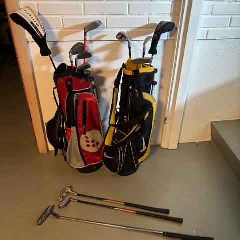 PGA Tour junior golfkøllesæt med bærebag i lilla og grå. Sættet indeholder driver, 9, S og putter som ses på billederne. Bærebaggen har flere lommer til opbevaring af bolde, tees og tilbehør samt polstrede seler til at bære sættet på ryggen. Egnet til begyndende juniorgolfere, der har brug for et sæt med taske til træning og spil på banen.
