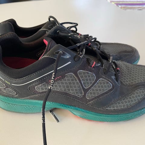 Skoene er i hvid med bred sort elastisk detalje over vristen.