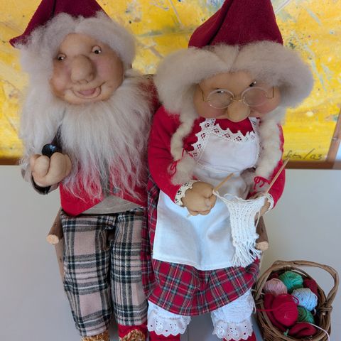 &Tradition julefigurer nissepar i tekstil. Sættet består af to figurer udformet som nissemand og nissemor i røde dragter med hvide kanter. Figurerne har strikkede ansigter, hår og skæg i garn samt små briller. De er velegnede som julepynt på bord, hylde eller vindueskarm i hjemmet i juletiden.